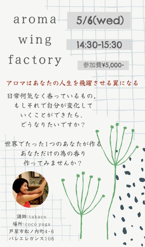 イベント『aroma wing factory』 投稿日: 2026年3月30日2026年3月30日 投稿者: takaco 久しぶりの開催とあって、参加費がお得になっています!先着6名さま、ご予約はLINEより✉︎ 2026年も半分が近づいてきたこの時に、もう一度今年どう生きていくか、どうやって目標に近づくか 一緒に考えてみましょう!